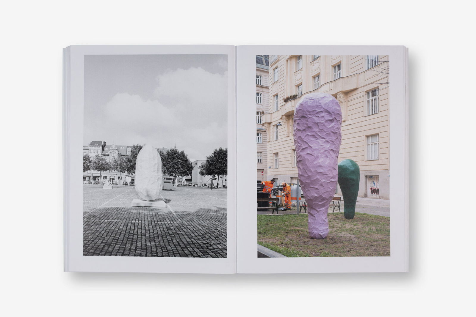 Domenig had already met West in the 1970s, with the earliest photo dating from 1979. In 1988, the two artists held a joint exhibition at Portikus in Frankfurt, which is documented here in detail for the first time in photographs by Gerald Domenig. In the text section, the author Domenig interweaves his ideas with his pictures in an original way. He talks about getting to know and working with Franz West and repeatedly illustrates his memories with photos, but also with his own poems. It gives him great pleasure to write a review of this exhibition from 35 years ago. But he also emphasizes that “his report is without any guarantee”.
