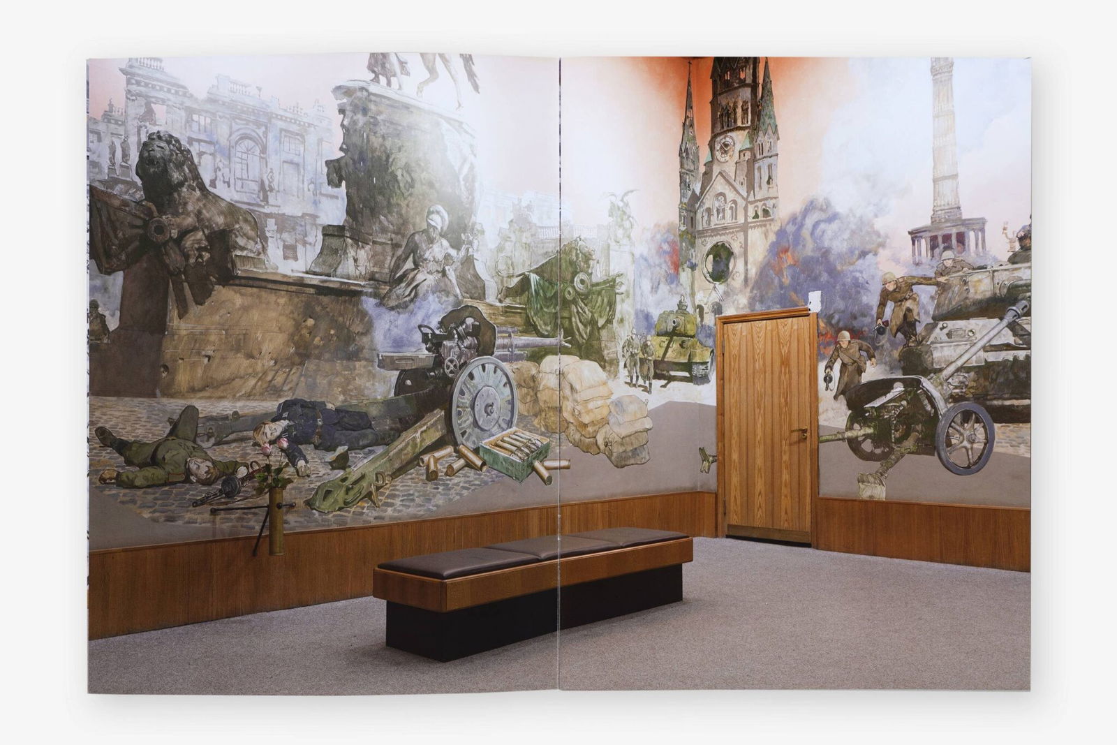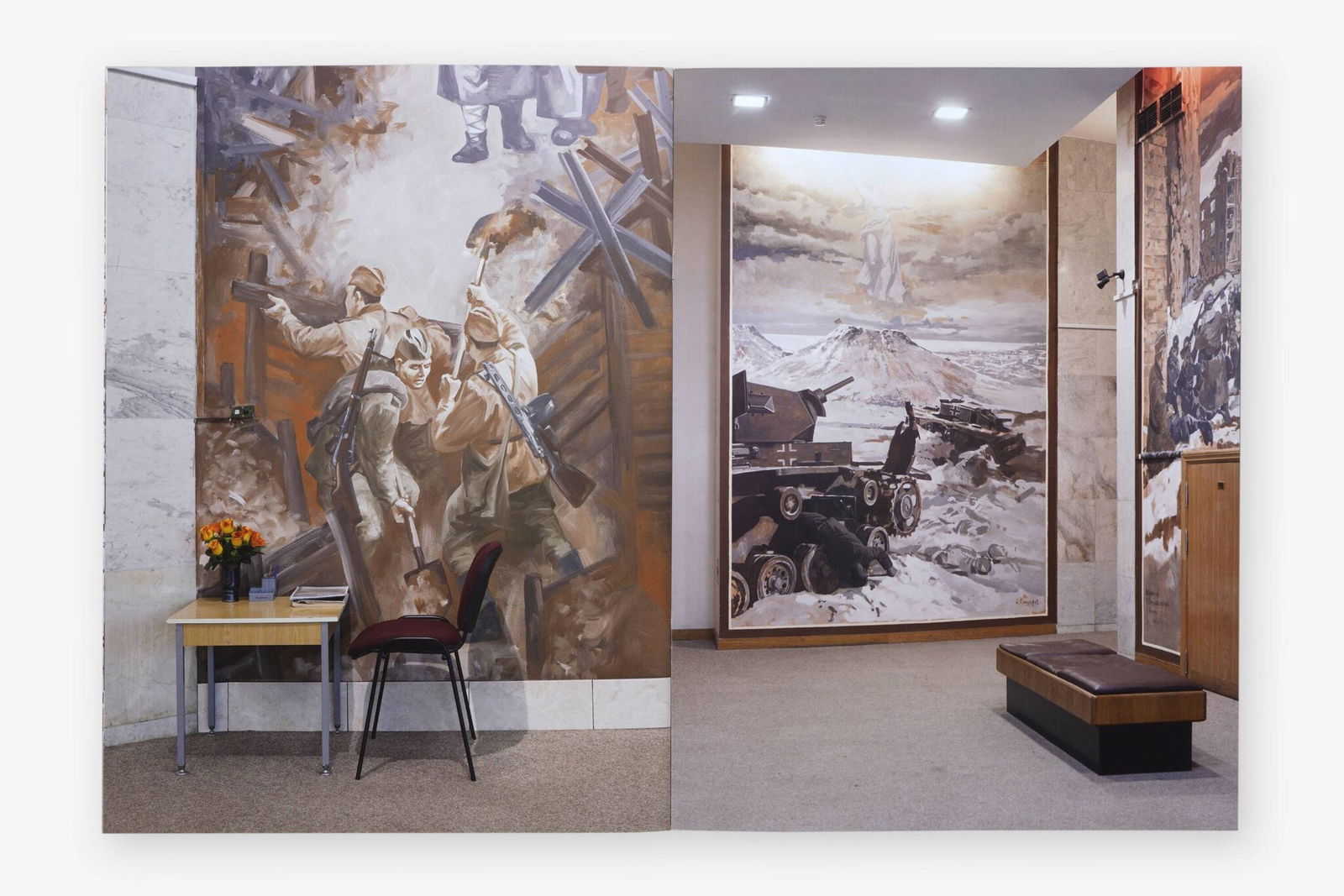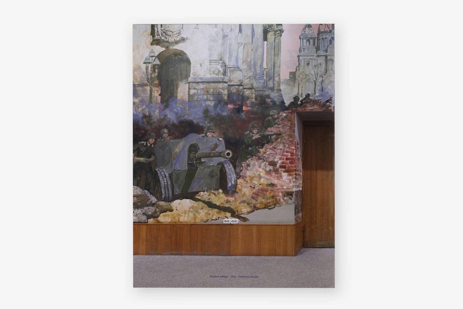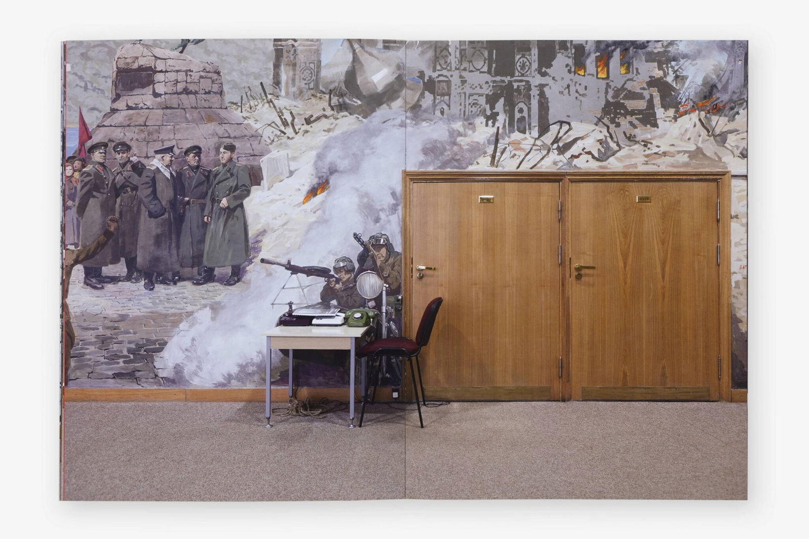 As the setting for her WAR ROOMS series of photographs, Katharina Gruzei chose the odd halls and premises of a Moscow museum. Indeed, at the Museum of the Great Patriotic War she turned her gaze away from the large-scale war dioramas to focus on areas of the museum space, in which museum structures and staging strategies become apparent. There pathos-filled murals of wartime activities engage in a bizarre dialogue with the museum’s functional level. Painted soldiers appear entrenched behind a desk that belongs to the museum staff. Elsewhere it seems like a gathered group of military commanders is staring at a red phone placed in the room.