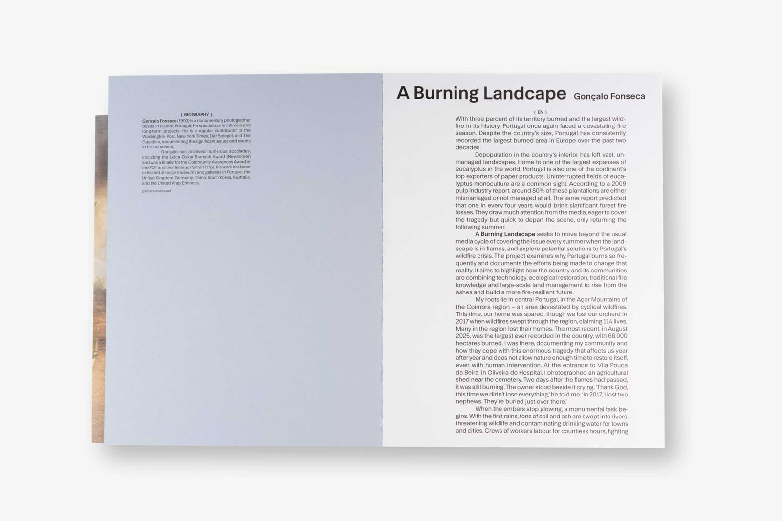 Gonçalo Fonseca versucht mit »A Burning Landscape« zu einem Ende der verheerenden Waldbrände in Portugal beizutragen. Seine Fotografien dokumentieren die Zerstörung der portugiesischen Waldlandschaft und zeigen die Bemühungen, Brände zu verhindern bzw. die Wiederaufforstung zu beschleunigen.